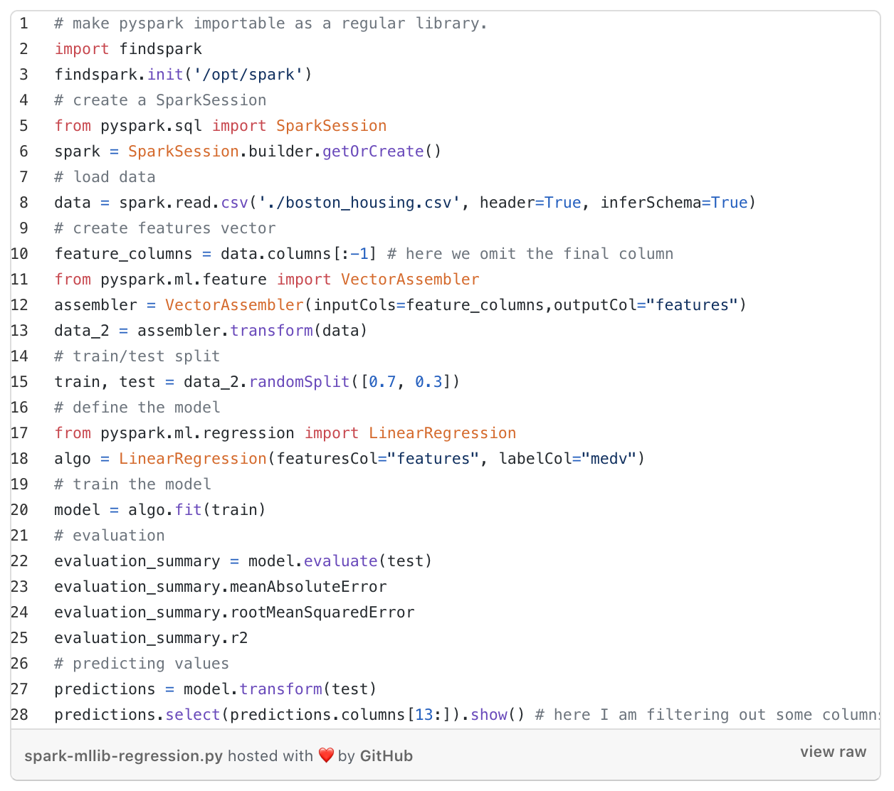 This tutorial builds off of a Boston Housing dataset. The goal is to use the 14 features, which consist of CRIM (per capita crime rate), RM (average number of rooms per dwelling), PTRATIO (pupil-teacher ratio by town), NOX (nitric oxide concentration), and others, to predict the value of MEDV (median housing price). It involves installing Python, Spark, the findspark library, Numpy, and Jupyter.