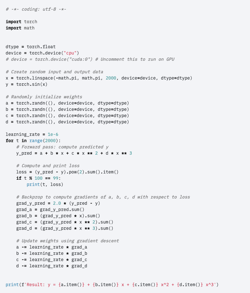 This tutorial walks through the example of fitting y=sin(x) with a third-order polynomial and training a network of four parameters with gradient descent “to fit random data by minimizing the Euclidean distance between the network output and the true output.”